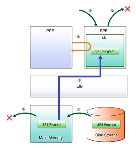 (1) (PPE Program) Loads the SPE program to the LS.