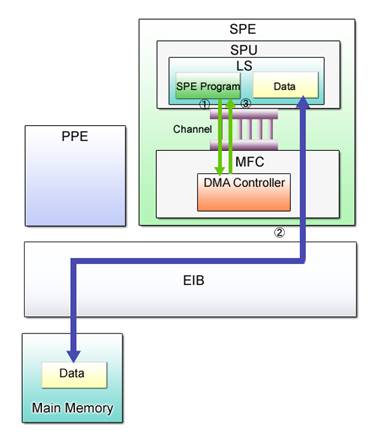Data transfer between the PPE program and the SPE program has been covered in this section. The SPE capitalizes on DMA transfer to transfer data to and from the main memory since it cannot directly access any memories except its own local memory.