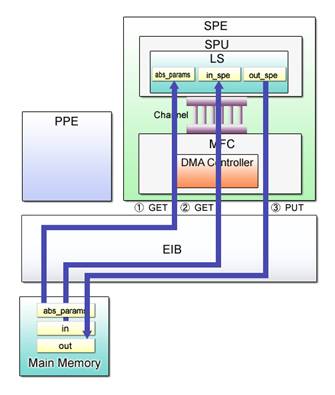 The most important point, however, is how to transfer image data between the main memory and the LS for processing by the SPE program. Please pay special attention to the size and address alignment of the data to be transferred using DMA transfer. Note the maximum transferable data size.
